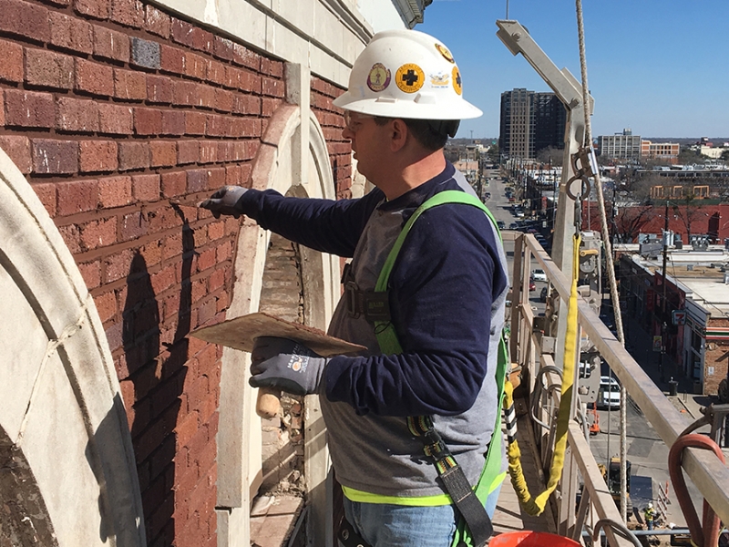 Work scopes included paint removal on 100% of the exterior masonry, repointing on approximately 60% of the mortar joints, cast stone cornice and sill string replacement, as well as redesign / reconstruction of missing decorative cast stone elements such as the upper frieze and the entry surrounds.